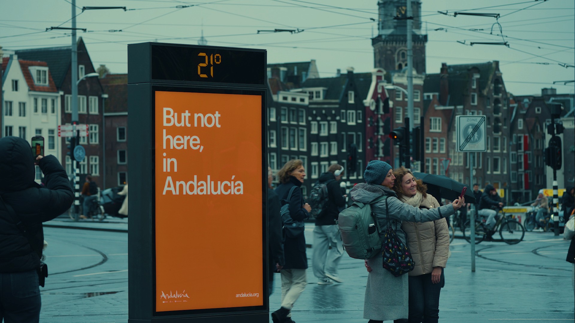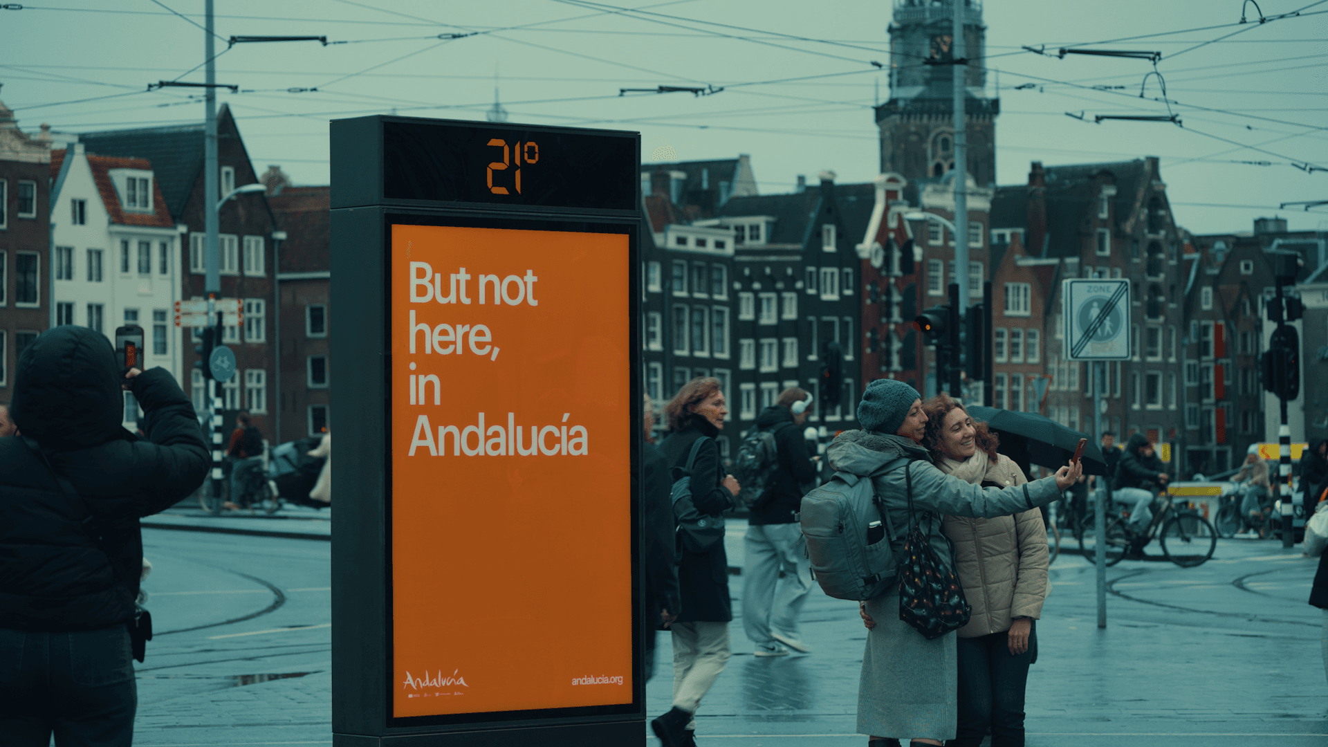 Ámsterdam se convirtió en el escenario de una sorprendente intervención urbana: alteramos un termómetro público para mostrar los 21 °C de un inverno andaluz en pleno corazón del norte de Europa.